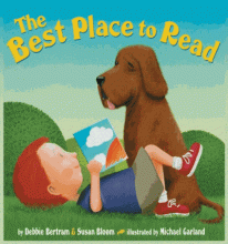 A young child with a new book hunts inside and outside the house before finding the right chair for reading.