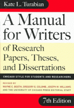 A guide to writing research papers, theses, and dissertations that addresses planning, finding and using sources, drafting, including tables and figures, revisions, citation practices, spelling, and the correct use of punctuation, names, terms, titles of works, numbers, abbreviations, and quotations. Includes format and submission requirements.
