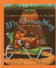 English and Spanish text describe how Mr. Groundhog tries to give away his Groundhog Day duties so that no one will get mad when he predicts there will be six more weeks of winter.